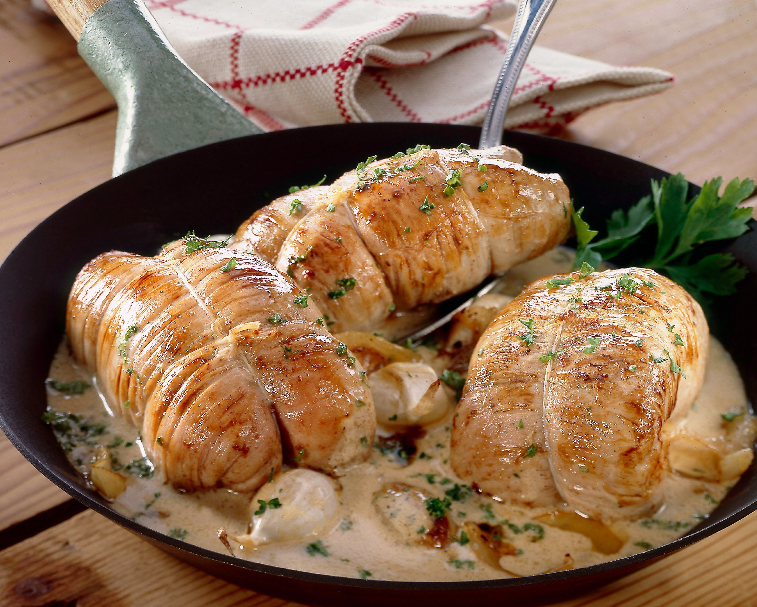 Servez les paupiettes de veau à la crème dans des assiettes chaudes, nappées de sauce. Garnissez avec du persil frais haché.